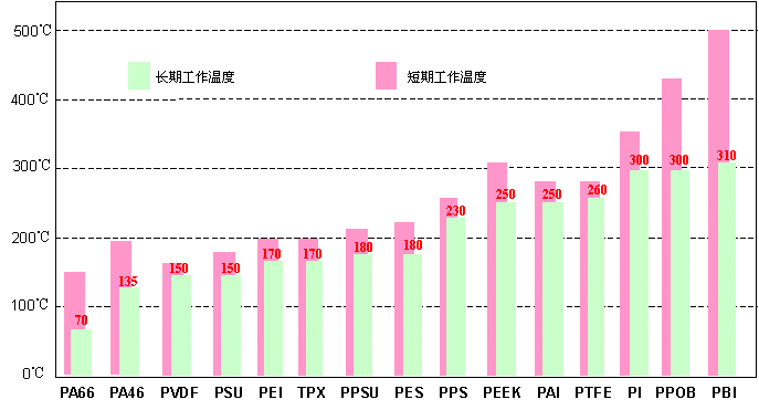 一些工程塑料的长短期工作温度的对比图,见下图: