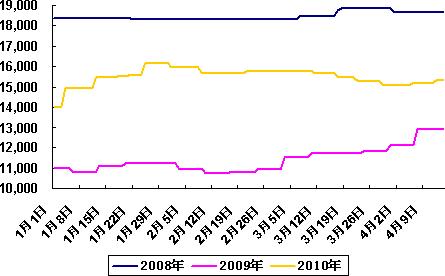 下面这张图为2008-2010年1-4月EVA市场价格的走势(以华南地区5110J市场价格为例)。