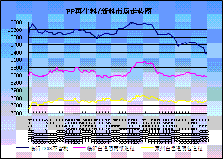 本周PP市场总体报价明显下滑,PP均聚现货纷纷跌破10000元/吨大关,但PP仓单市场在9700元/吨出现支撑反弹迹象。市场价格方面,除华北地区拉丝价格相对偏低外,PP现货市场主流报价都在10000元/吨左右。截止到周四,华北拉丝主流报价在9750-9800元/吨,低熔共聚在10000-10200元/吨。华东地区市场,拉丝主流报价在9900-10000元/吨,低熔共聚在10000-10200元/吨。华南地区拉丝主流报价在10000元/吨,低熔共聚价格偏低,EPS30R报价在10000元/吨。