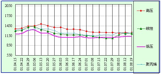A、聚乙烯市场(PE):本周亚洲聚乙烯市场稳中趋淡,报价僵持,大部分进口商退出场外,交易达成稀少。大部分买主相信聚乙烯市场走向很大程度上取决于原油、乙烯单体走向及主要国家的经济数据。本周亚洲地区聚乙烯报价如下: 高压1250;低压膜料1170低压中空1130;线性1220美元/吨(CFR 中国主港/东南亚)。