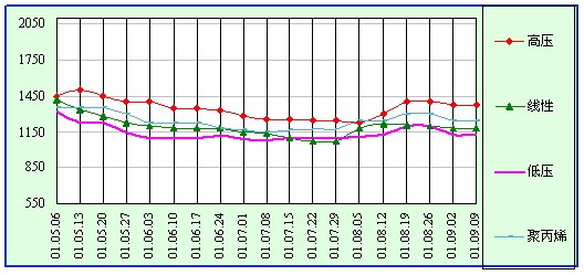 A、聚乙烯市场(PE):本周亚洲聚乙烯市场报价僵持暂稳,交易明显放缓,大部分进口商已经满足9月需求,不急于入市采购,贸易商多持谨慎观望态度。本周亚洲地区聚乙烯报价如下: 高压1380;低压膜料1130低压中空1130;线性1180美元/吨(CFR 中国主港/东南亚)。